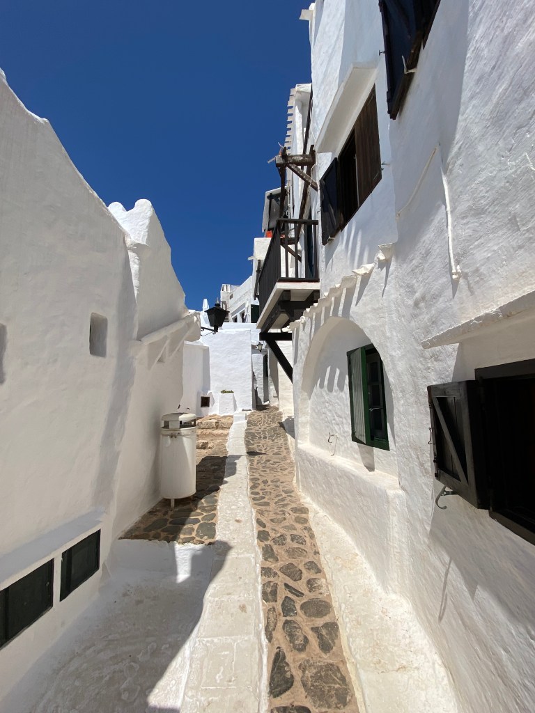 Nous avons pris le bus (enfin 2 bus), cette fois aller de l’autre coté de l’île, direction Mahon puis Binibeca. Nous avons profité de notre changement de bus pour aller manger dans le centre de Mahon puis nous avions 15/20 min de bus jusqu’à Binibeca.